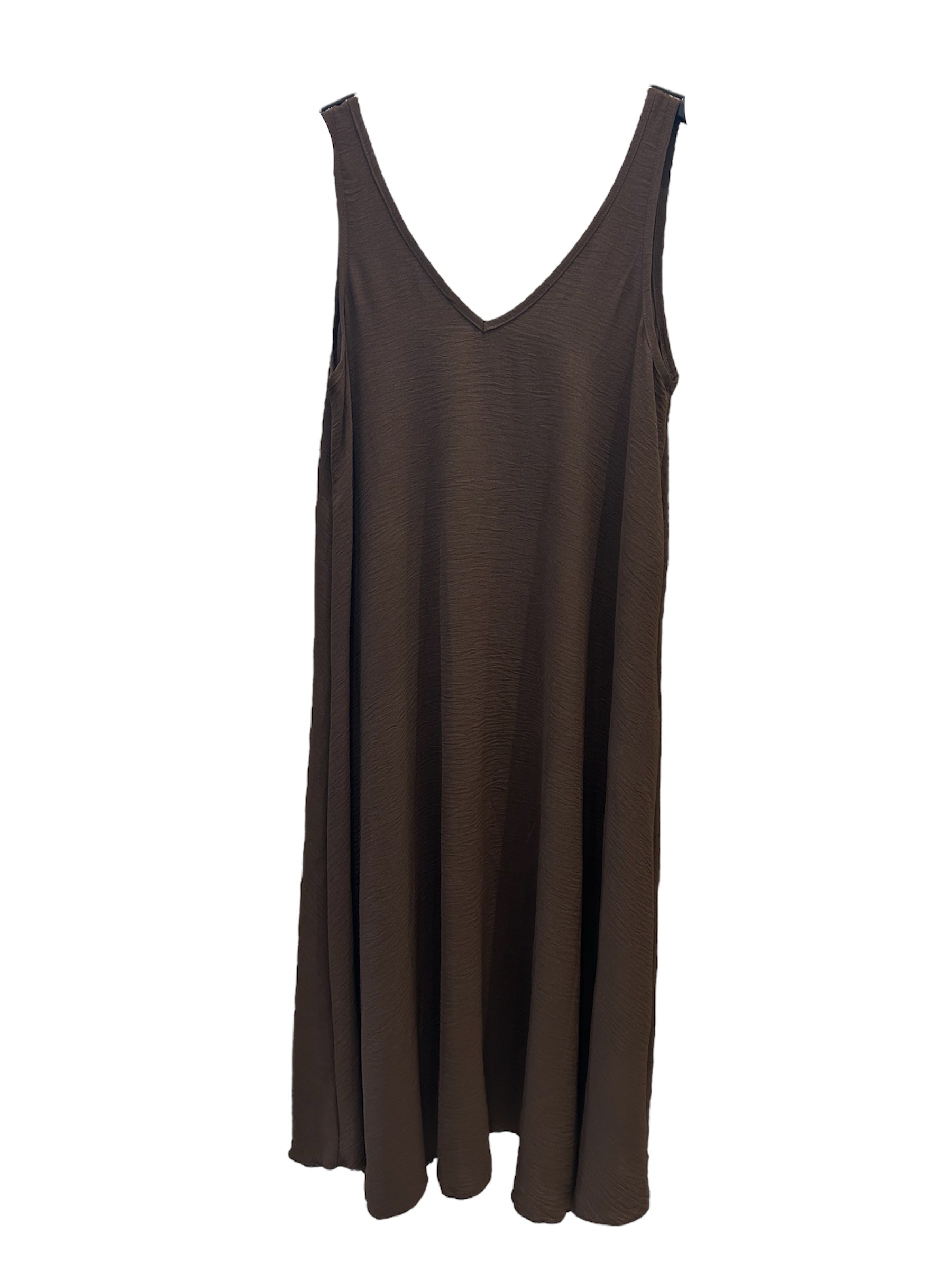 Raffinato e versatile, questo abito lungo senza maniche è realizzato in una maglia leggera e fluida, perfetta per le giornate più calde. Il taglio ampio e la scollatura a V sul davanti donano un tocco di eleganza minimalista, rendendolo ideale sia per un look casual da giorno che per una serata estiva. Il colore marrone caffè aggiunge profondità e calore, facilmente abbinabile con accessori neutri o vivaci.