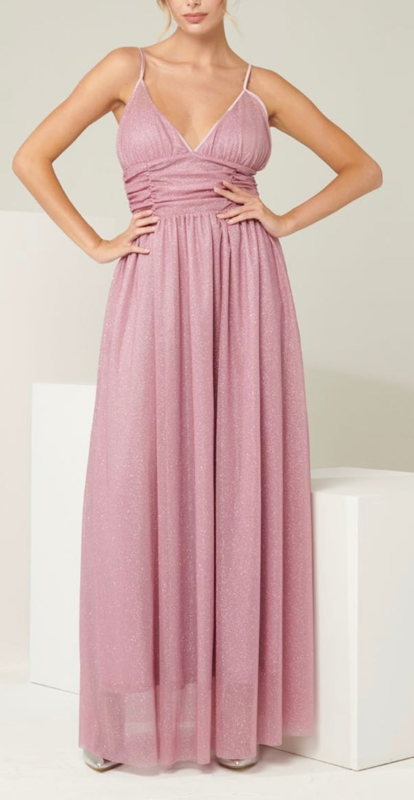 L’abito da cerimonia "Aurora" è la perfetta fusione di eleganza e romanticismo. Realizzato in tessuto glitterato rosa cipria, presenta un corpino con scollo a V profondo e sottili spalline che esaltano con delicatezza la silhouette. Il taglio impero e la gonna lunga svasata donano un effetto etereo, rendendolo ideale per matrimoni, eventi serali e serate da favola. Brilla con grazia in ogni occasione.