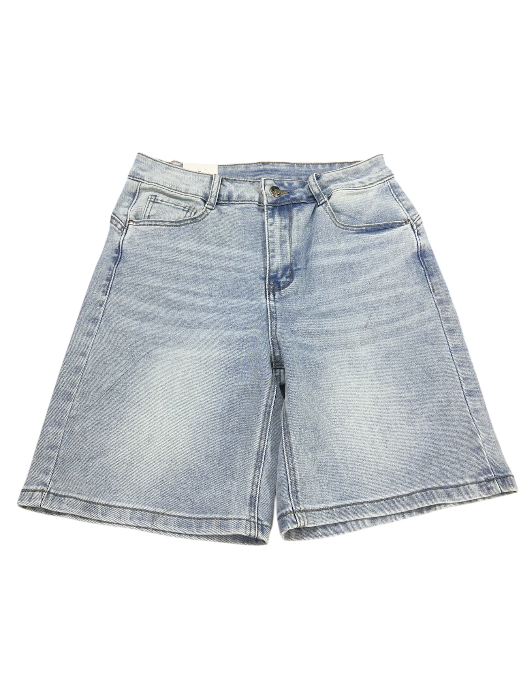 Linee pulite e stile urbano per questa bermuda in denim a lavaggio chiaro. Il design a gamba dritta e ampia offre massimo comfort e libertà di movimento, mentre il taglio leggermente sopra al ginocchio la rende perfetta per la stagione estiva. Realizzata in cotone denim resistente, presenta tasche anteriori e posteriori, passanti per cintura e chiusura con bottone e zip. Ideale per look casual, streetwear o per outfit unisex rilassati ma curati.