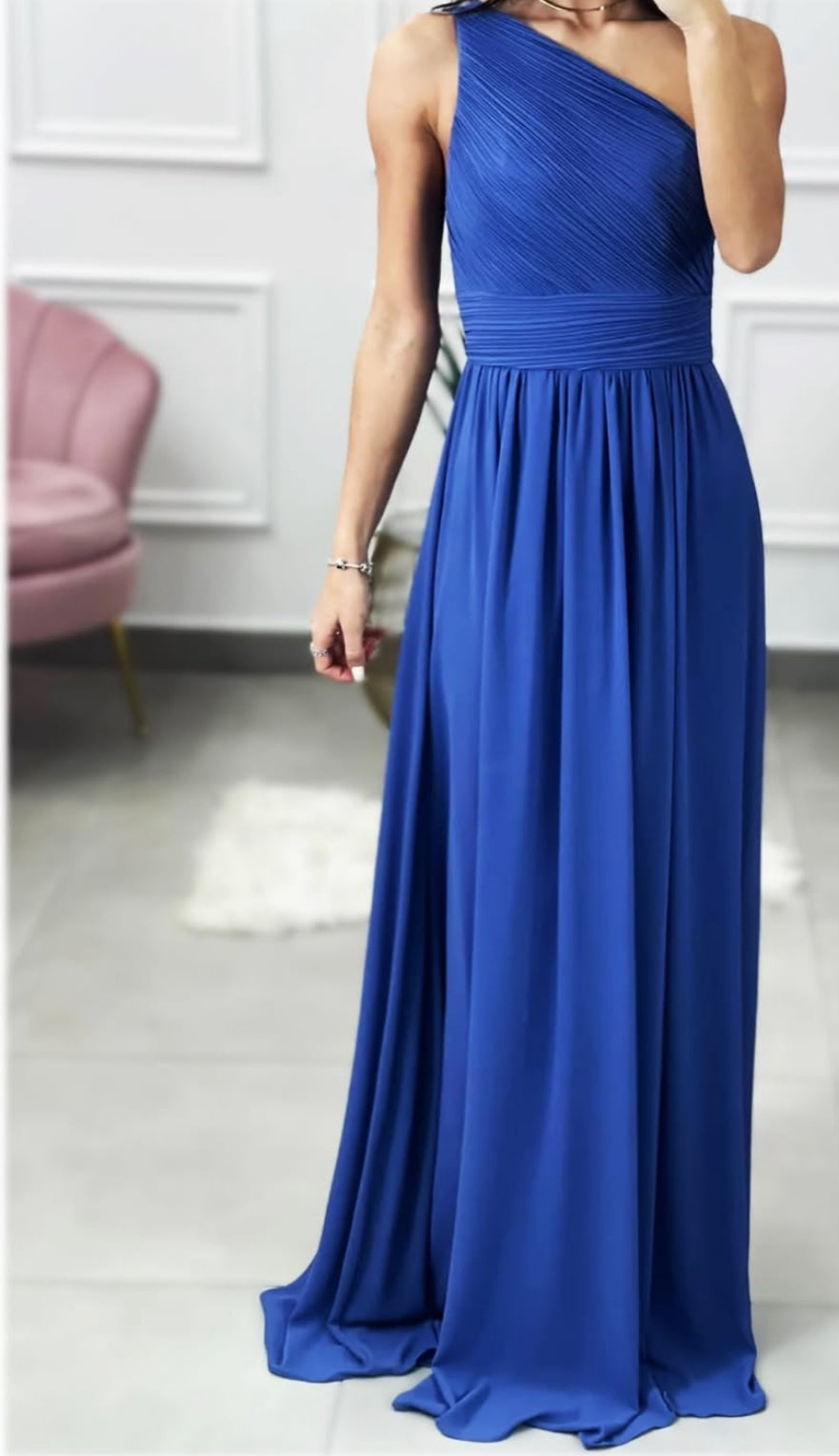 L’abito “Blu Sera” è la perfetta espressione di eleganza minimalista. Con il suo design monospalla e la lavorazione plissé del corpetto, questo abito lungo in un’intensa tonalità blu royal è pensato per valorizzare con raffinatezza ogni figura.