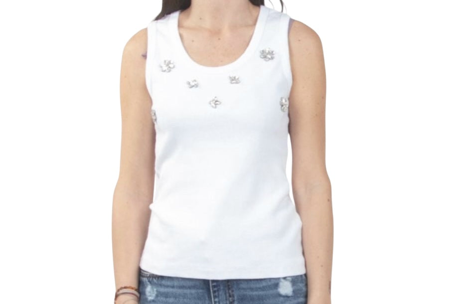 Eleganza e semplicità si incontrano in questa canotta bianca con applicazioni gioiello. Il design smanicato e la vestibilità aderente la rendono perfetta per le giornate estive o per essere indossata sotto un blazer. Le decorazioni brillanti aggiungono un tocco raffinato e luminoso, ideale per outfit casual chic o per un look serale informale. Un capo versatile e di carattere, facile da abbinare a jeans, pantaloni o gonne.
