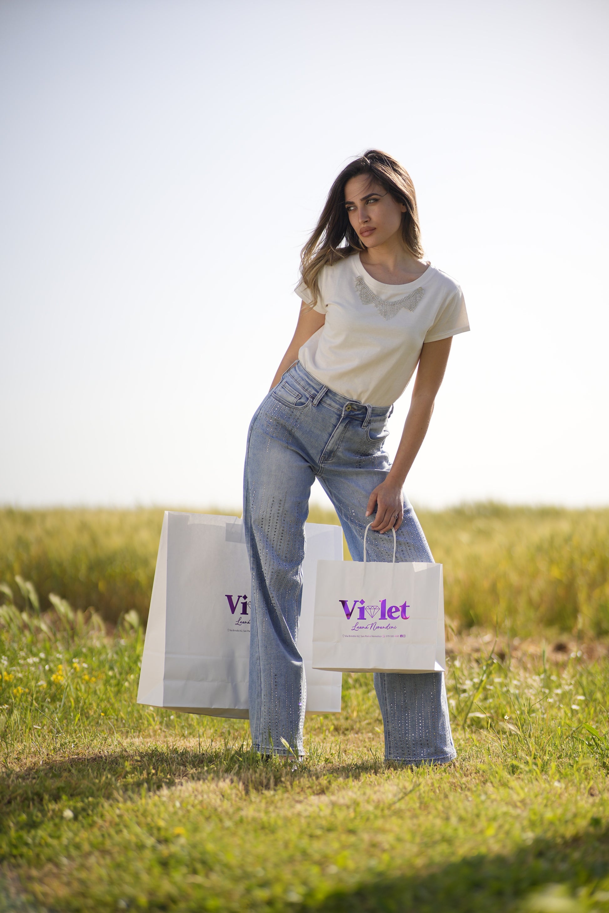 I jeans "Crystal Light" uniscono comfort e stile con un tocco di brillante eleganza. Realizzati in denim chiaro e decorati con micro-strass applicati lungo le gambe, sono pensati per chi vuole distinguersi con classe anche nei look più casual. Il taglio a palazzo valorizza la silhouette, rendendoli perfetti sia con sneakers che con tacchi.