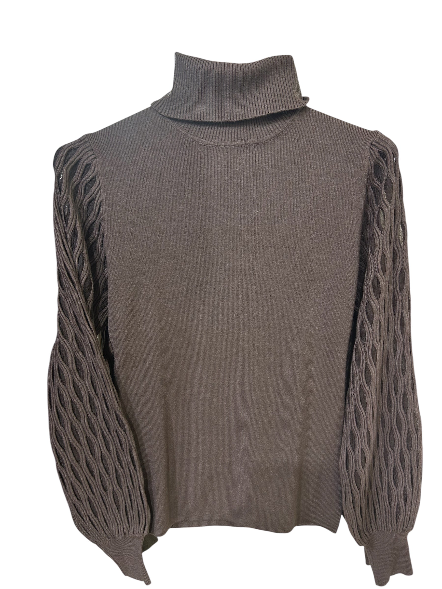 Elegante maglione da donna in morbida maglia marrone, caratterizzato da un raffinato collo alto a costine. Il design è impreziosito da maniche lunghe con lavorazione a intreccio tridimensionale, che aggiunge un tocco di originalità e stile. Vestibilità comoda e taglio dritto, perfetto da abbinare sia a pantaloni che a gonne per un look sofisticato e moderno. Ideale per le stagioni autunnali e invernali.