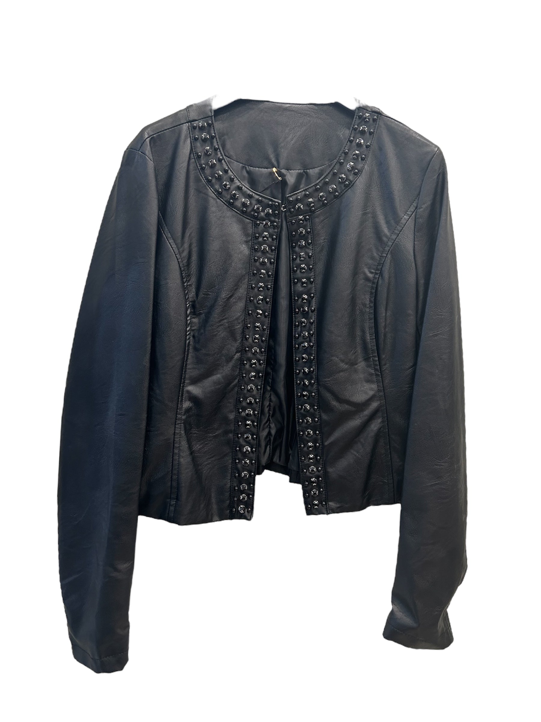 Distinguiti con stile grazie a questa giacca nera in ecopelle impreziosita da borchie applicate lungo lo scollo e la parte frontale. Il taglio corto e la vestibilità aderente valorizzano la figura, mentre i dettagli decorativi donano un tocco grintoso e glamour. Perfetta per outfit serali o per dare carattere anche ai look più semplici.