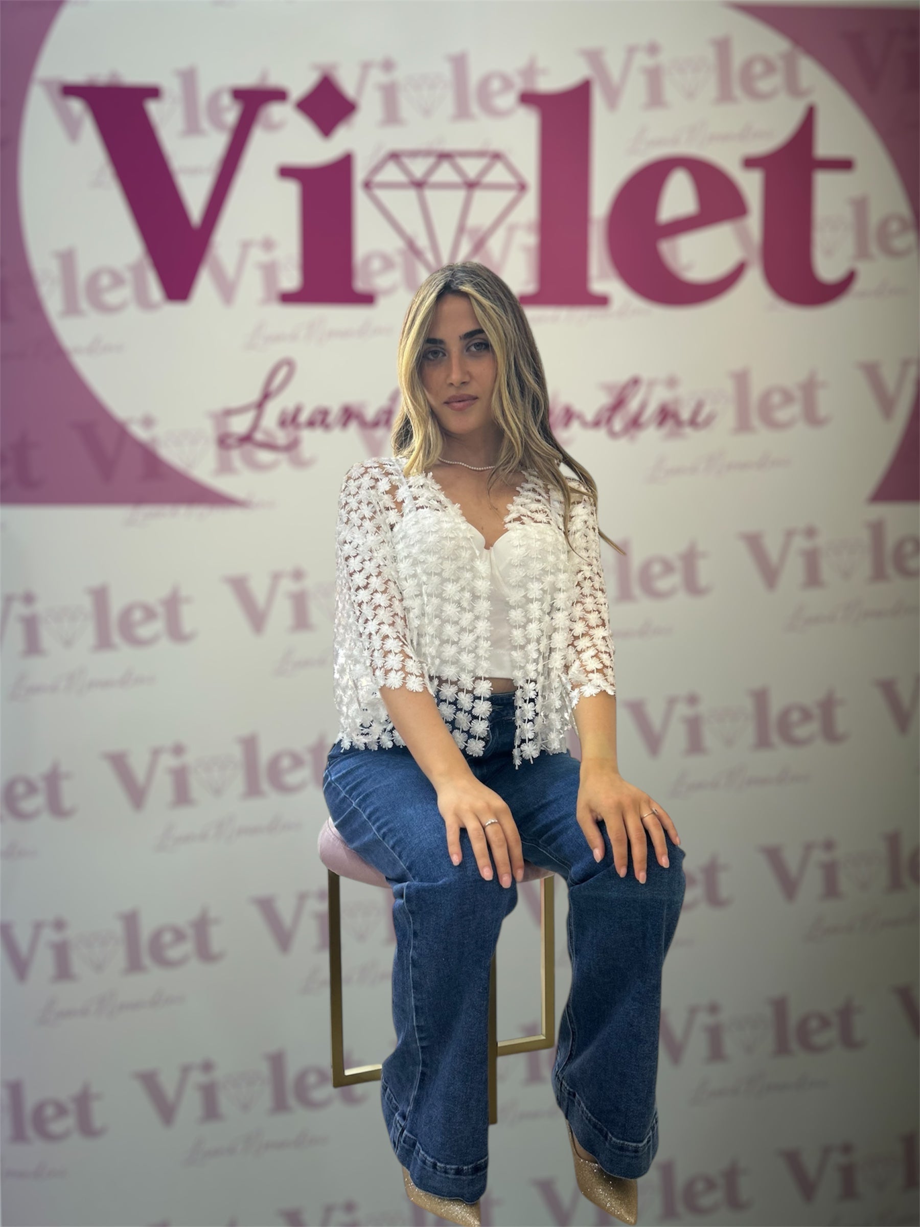 Giacchino corto e trasparente realizzato in rete leggera, decorato con eleganti fiori tridimensionali bianchi. Un capo femminile e romantico, perfetto da indossare sopra top, body o abiti leggeri per aggiungere un tocco sofisticato e originale