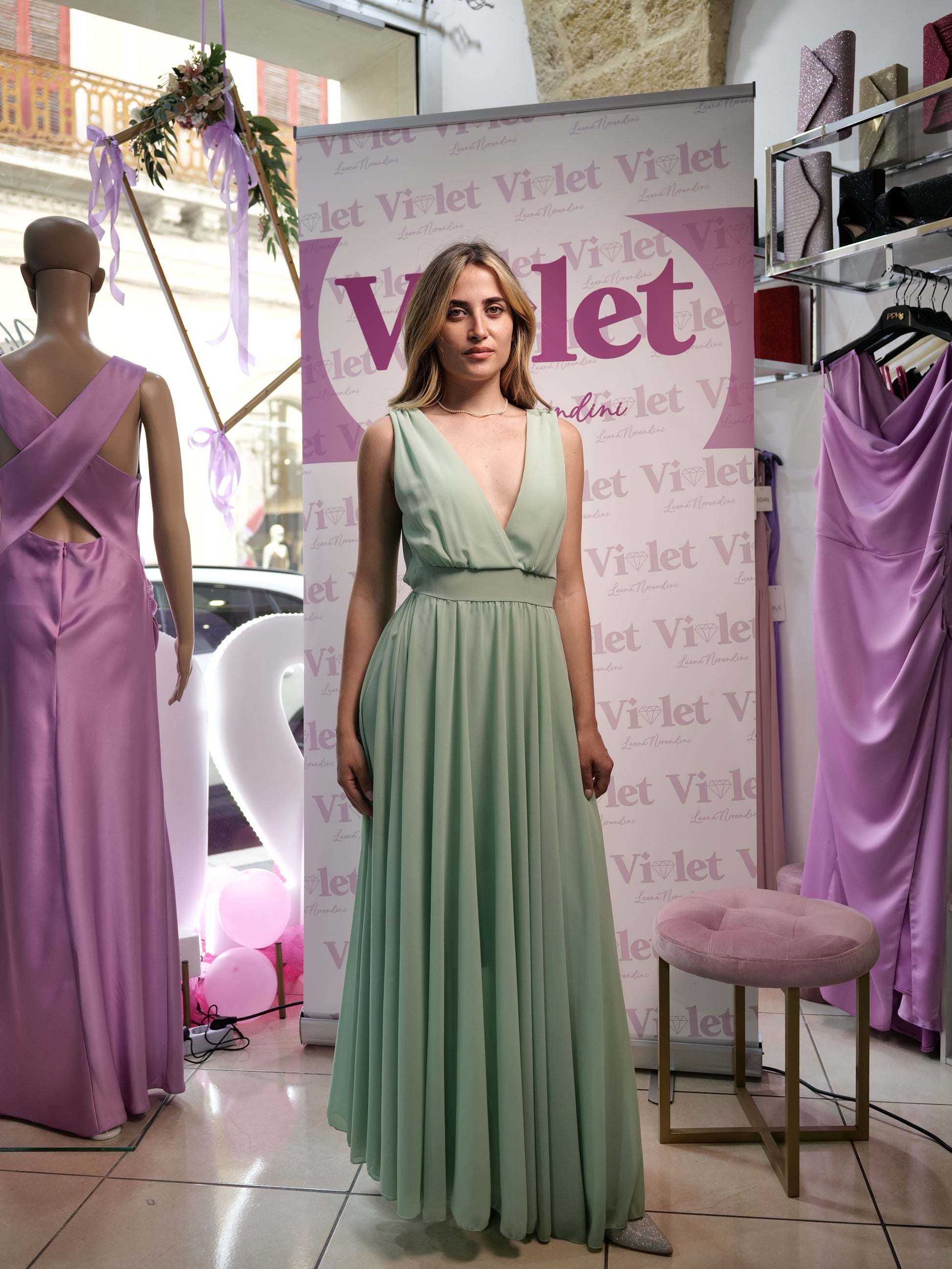 Classico vestito verde, reinterpretato in chiave moderna. Caratterizzato da uno scollo a V profondo e una gonna lunga e fluida con taglio svasato, dona movimento e leggerezza a ogni passo.