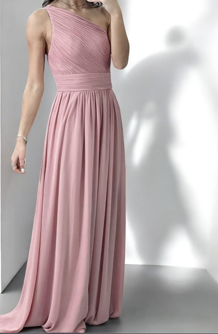 L'abito "Iside" è l'emblema della femminilità e dell'eleganza senza tempo. Caratterizzato da un raffinato design monospalla, questo abito lungo in rosa antico è perfetto per cerimonie, matrimoni, eventi formali o serate di gala. Il corpino presenta una lavorazione plissé diagonale che valorizza il décolleté, mentre la gonna ampia e fluida scende con leggerezza, creando un effetto etereo e armonioso.