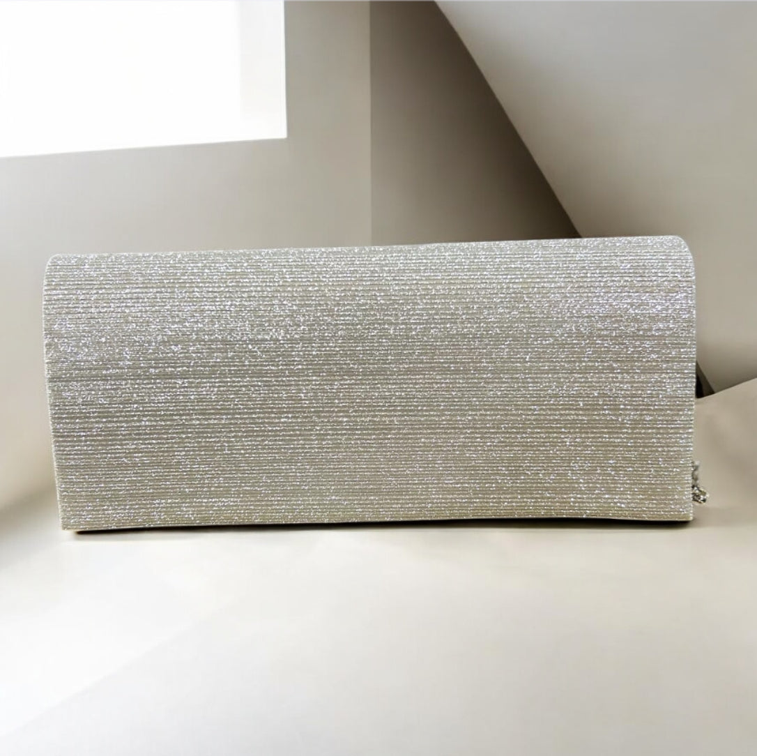 Elegante e raffinata, la pochette "Luce d’Argento" è l’accessorio perfetto per illuminare ogni tuo outfit da sera. Realizzata con tessuto glitterato a righe sottili, dona un tocco di brillantezza senza eccessi. Ideale per cerimonie, eventi speciali o serate chic.