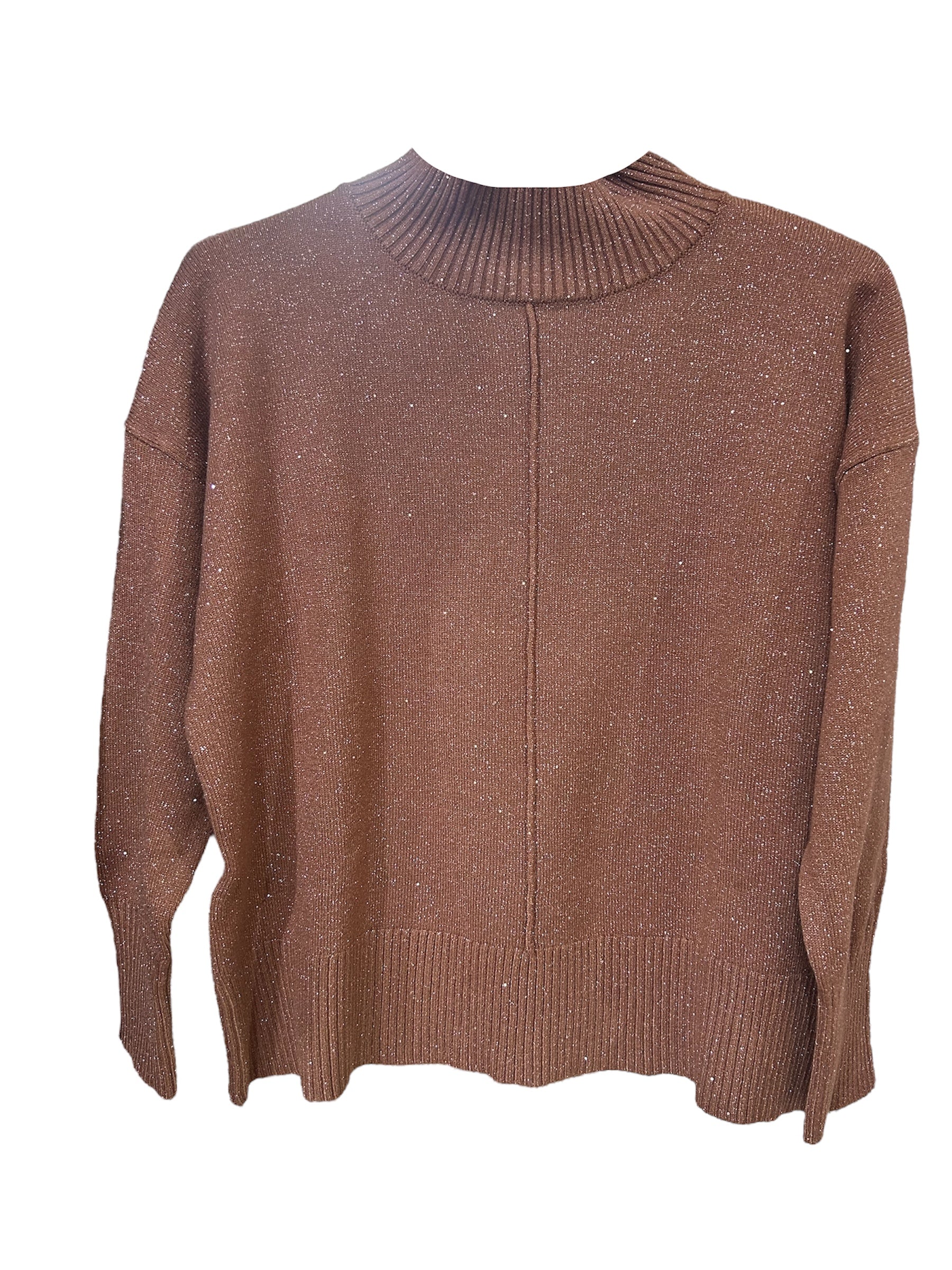 Maglioncino dolcevita in lurex, dal colore cioccolato caldo con delicati riflessi luminosi. Un modello morbido, confortevole e raffinato, perfetto per aggiungere un tocco di eleganza scintillante ai tuoi outfit autunnali e invernali. Ideale sia con jeans che con gonne, per un look casual-chic senza sforzo.