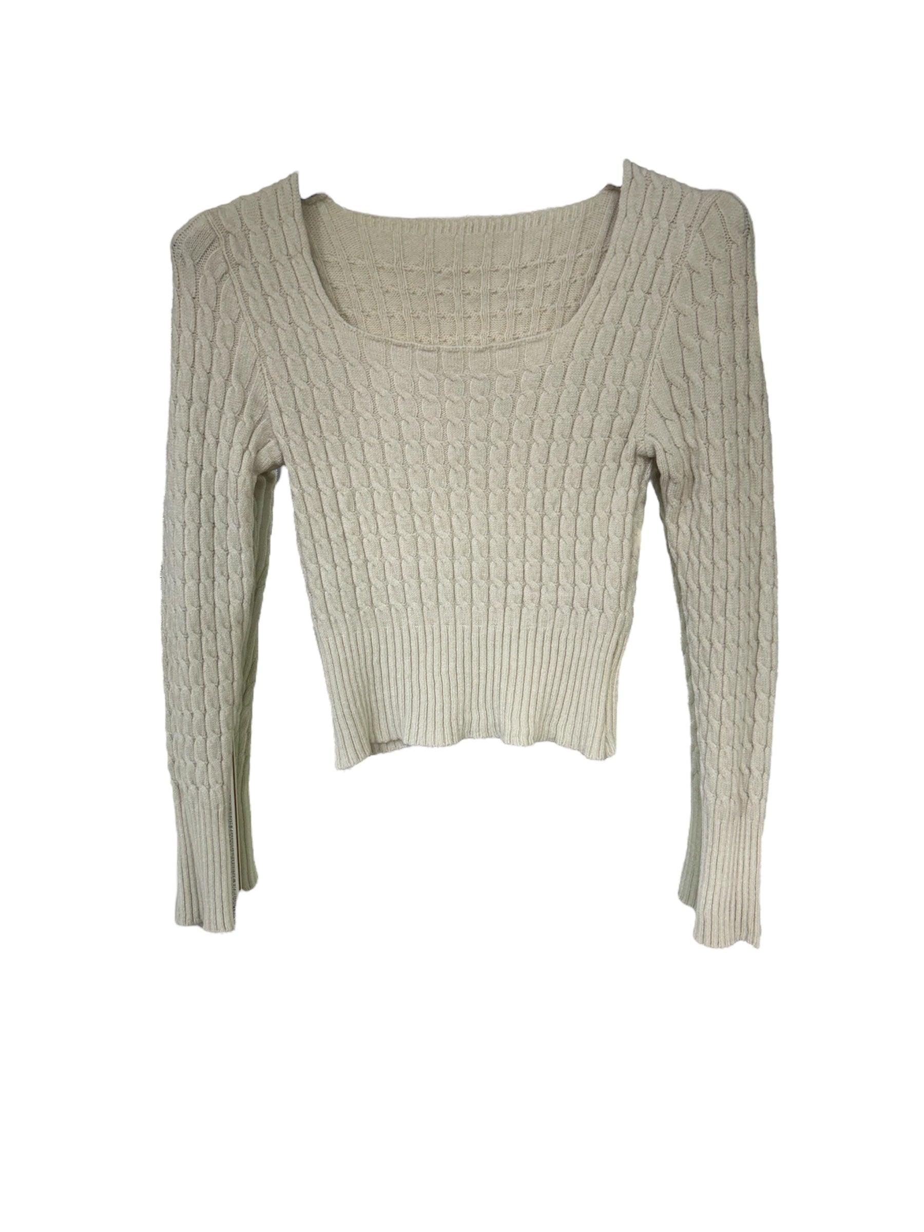 Maglioncino cropped a trecce dal gusto raffinato e contemporaneo. Il design a manica lunga con lavorazione intrecciata lo rende caldo e avvolgente, mentre lo scollo quadrato aggiunge un tocco femminile e moderno. Perfetto da indossare con jeans a vita alta o gonne a vita media per un look casual ma curato