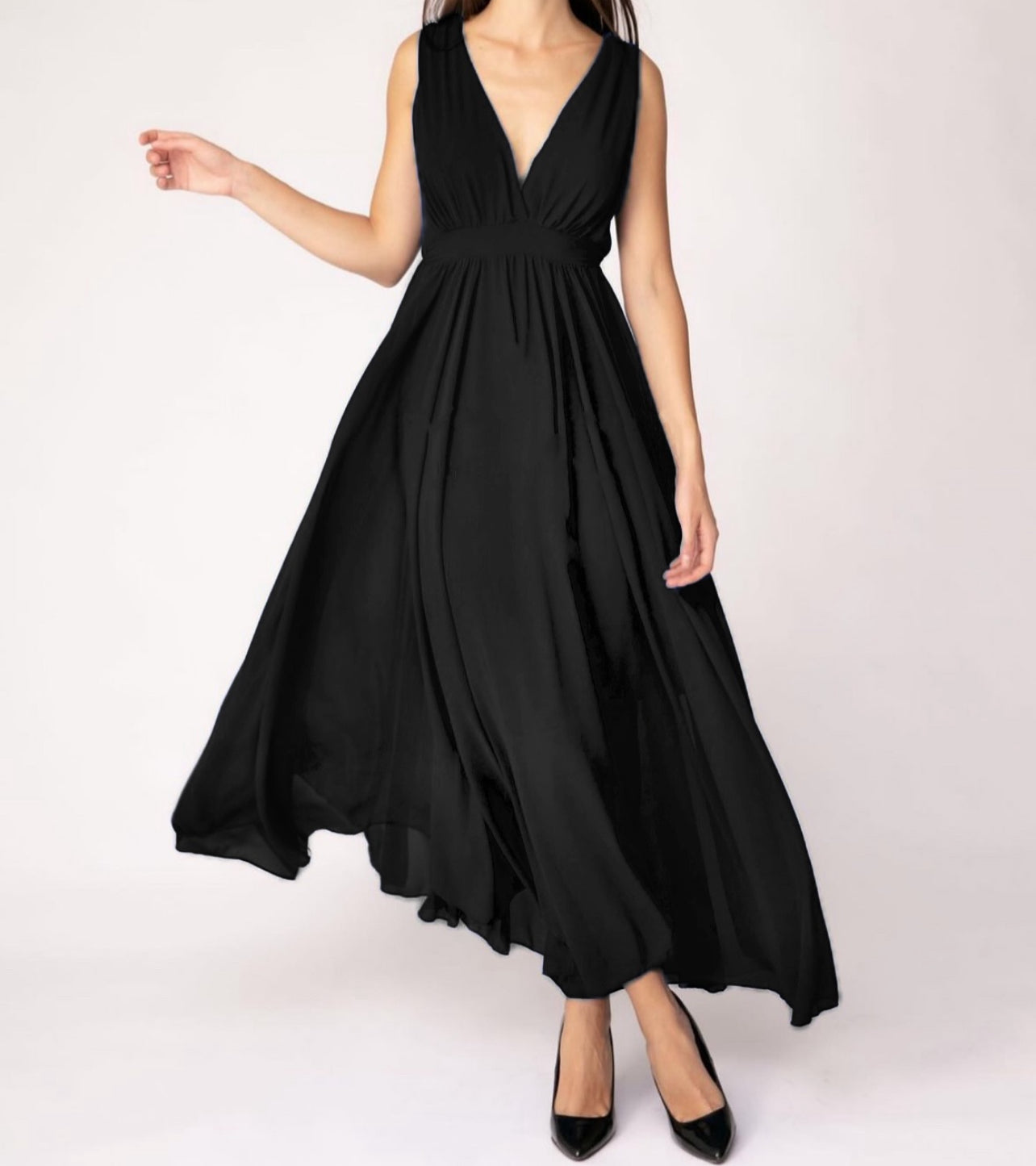 Classico vestito nero, reinterpretato in chiave moderna. Caratterizzato da uno scollo a V profondo e una gonna lunga e fluida con taglio svasato, dona movimento e leggerezza a ogni passo.