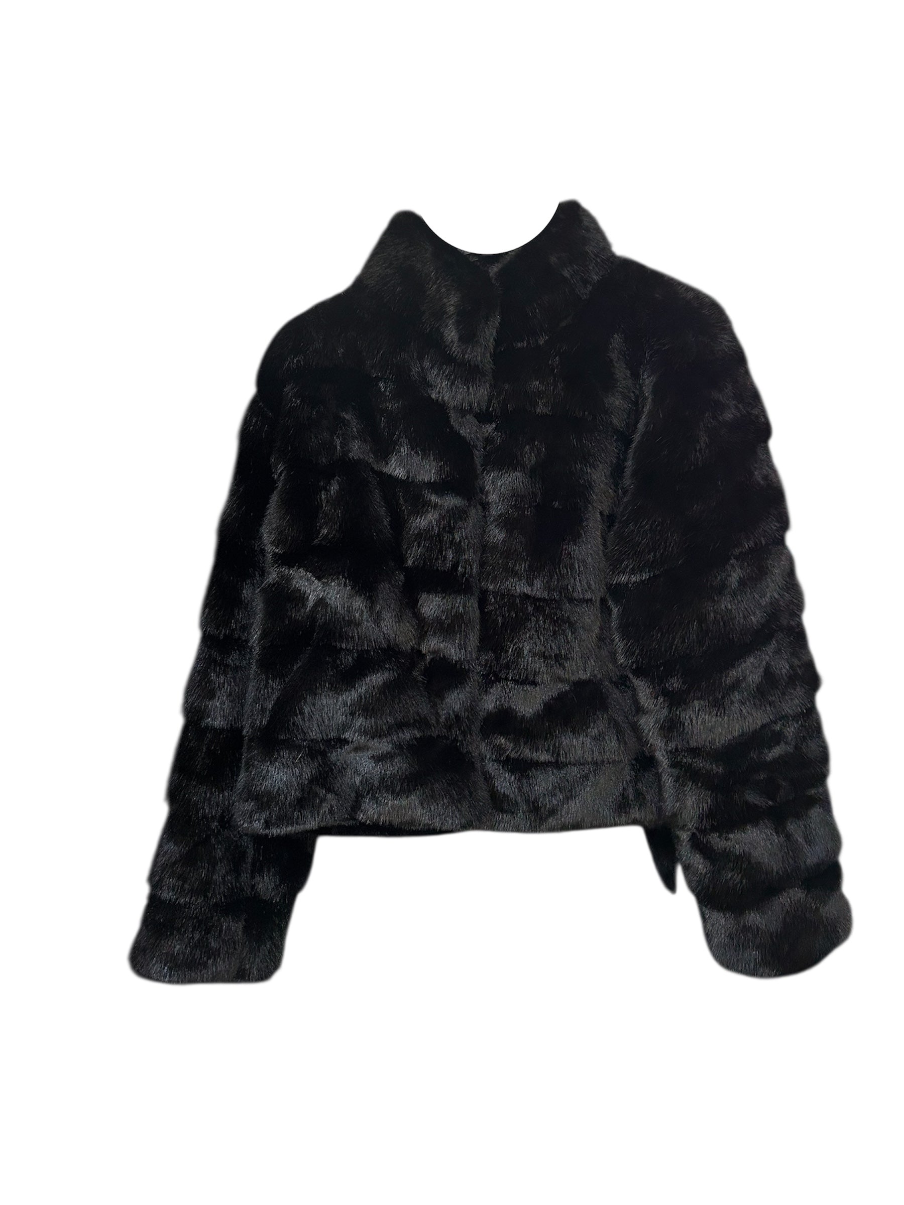 Pelliccia corta nera effetto visone, un classico intramontabile rivisitato in chiave moderna. Morbida, calda e super chic, è il capo perfetto per dare un tocco elegante e deciso a ogni outfit. Da indossare di giorno o di sera, per uno stile che non passa inosservato.