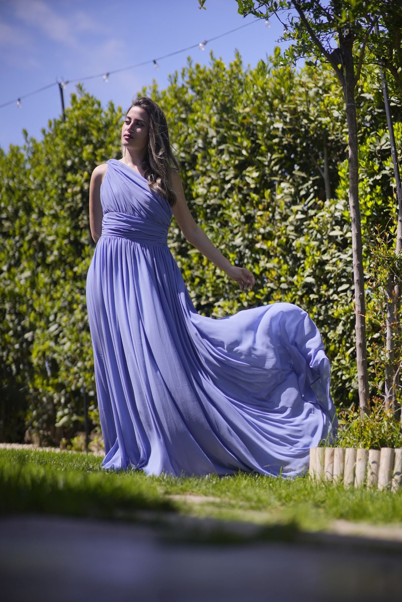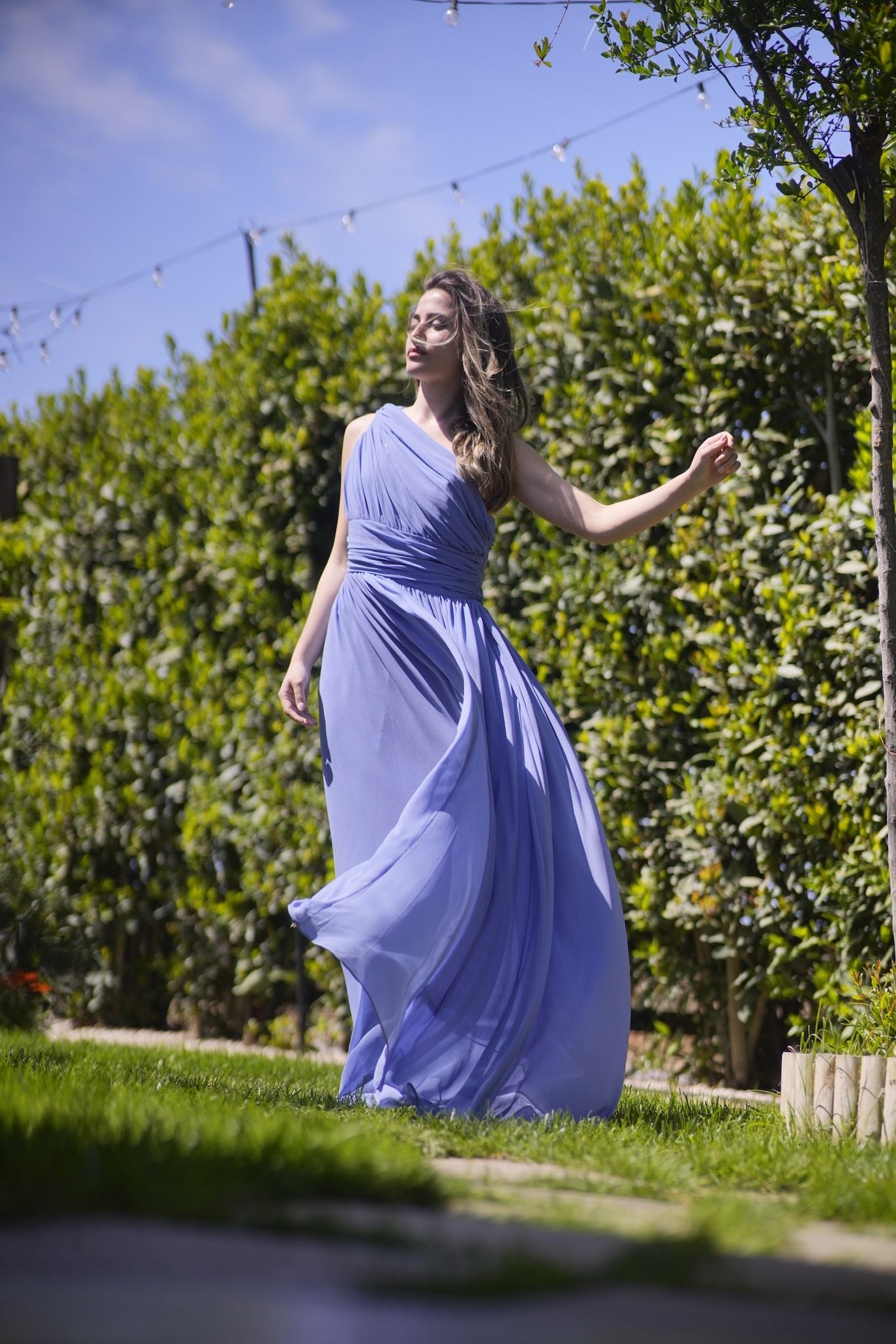 Il design monospalla dona un tocco moderno e sensuale, mentre la tonalità celeste conferisce freschezza e romanticismo, ideale per la stagione primaverile ed estiva. Il corpino sagomato e la gonna leggermente svasata creano un equilibrio armonioso tra struttura e movimento.