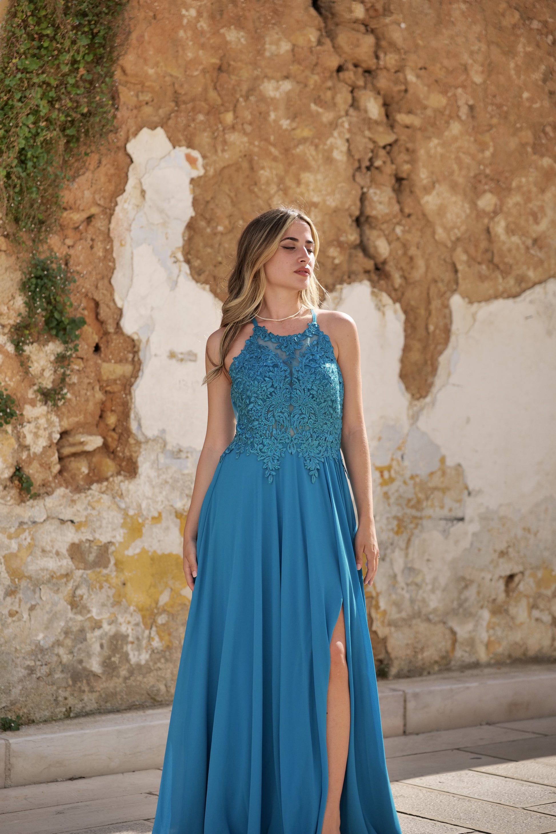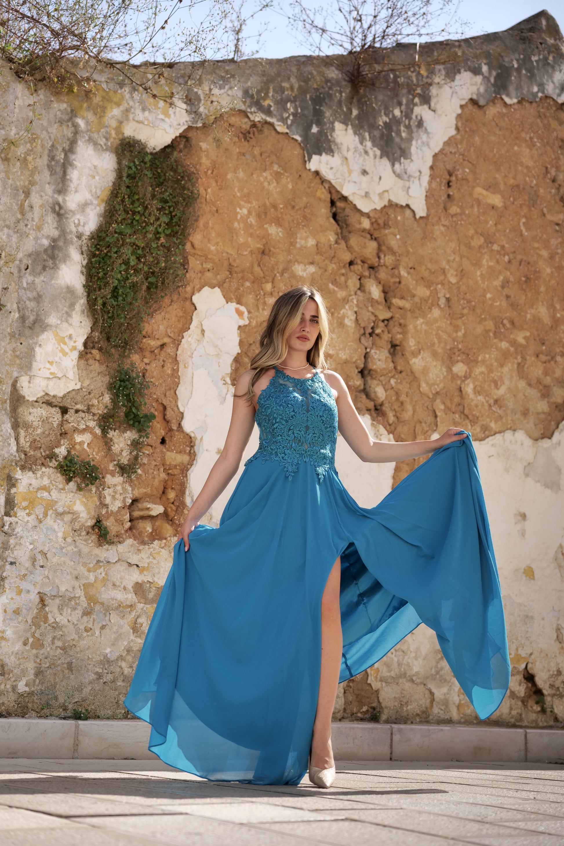 Leggero come l’aria, luminoso come il cielo d’estate: questo abito con corpino in pizzo ricamato e spacco laterale unisce romanticismo e sensualità. Il bustino in pizzo delicatamente trasparente valorizza il décolleté e la silhouette, mentre la gonna in tessuto fluido scivola con grazia ad ogni passo, rivelando con eleganza la gamba grazie allo spacco laterale