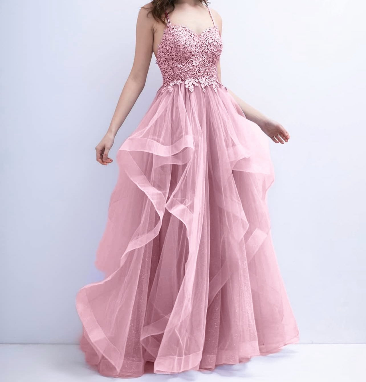 Romantico, etereo e da sogno: Rosa Incanto è l'abito perfetto per serate da favola. Il corpetto in pizzo ricamato, impreziosito da dettagli floreali, abbraccia il busto con grazia, mentre la gonna in tulle multistrato si apre leggera come una nuvola. Le spalline sottili e il taglio a cuore donano un'aria fiabesca e delicata. Ideale per cerimonie, balli o momenti speciali in cui ogni dettaglio conta.