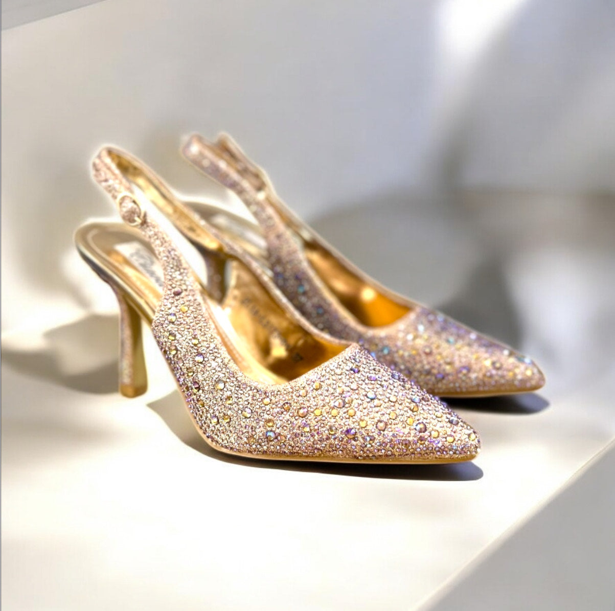 Scopri la magia delle Stella di Cristallo, le décolleté gioiello che trasformeranno ogni tuo passo in un momento di pura luce. Queste eleganti slingback con tacco a spillo sono interamente ricoperte da cristalli multicolore effetto aurora boreale, che catturano la luce e donano un effetto scintillante a ogni movimento.