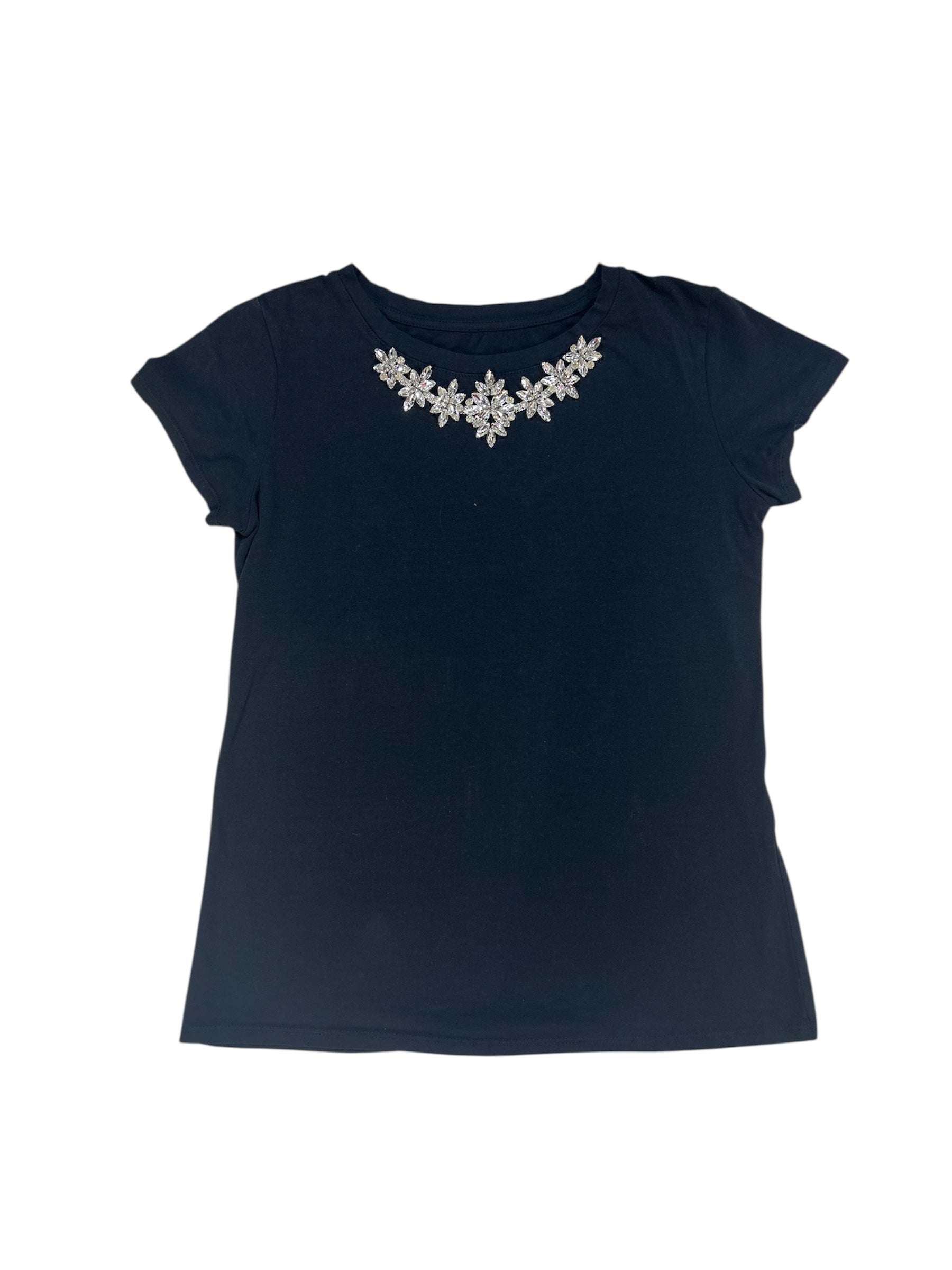 Un capo essenziale che unisce eleganza e comfort: questa t-shirt nera è impreziosita da un'applicazione gioiello sullo scollo, che simula l'effetto di una collana con cristalli scintillanti. Un'ottima scelta per creare un look raffinato senza sforzo.