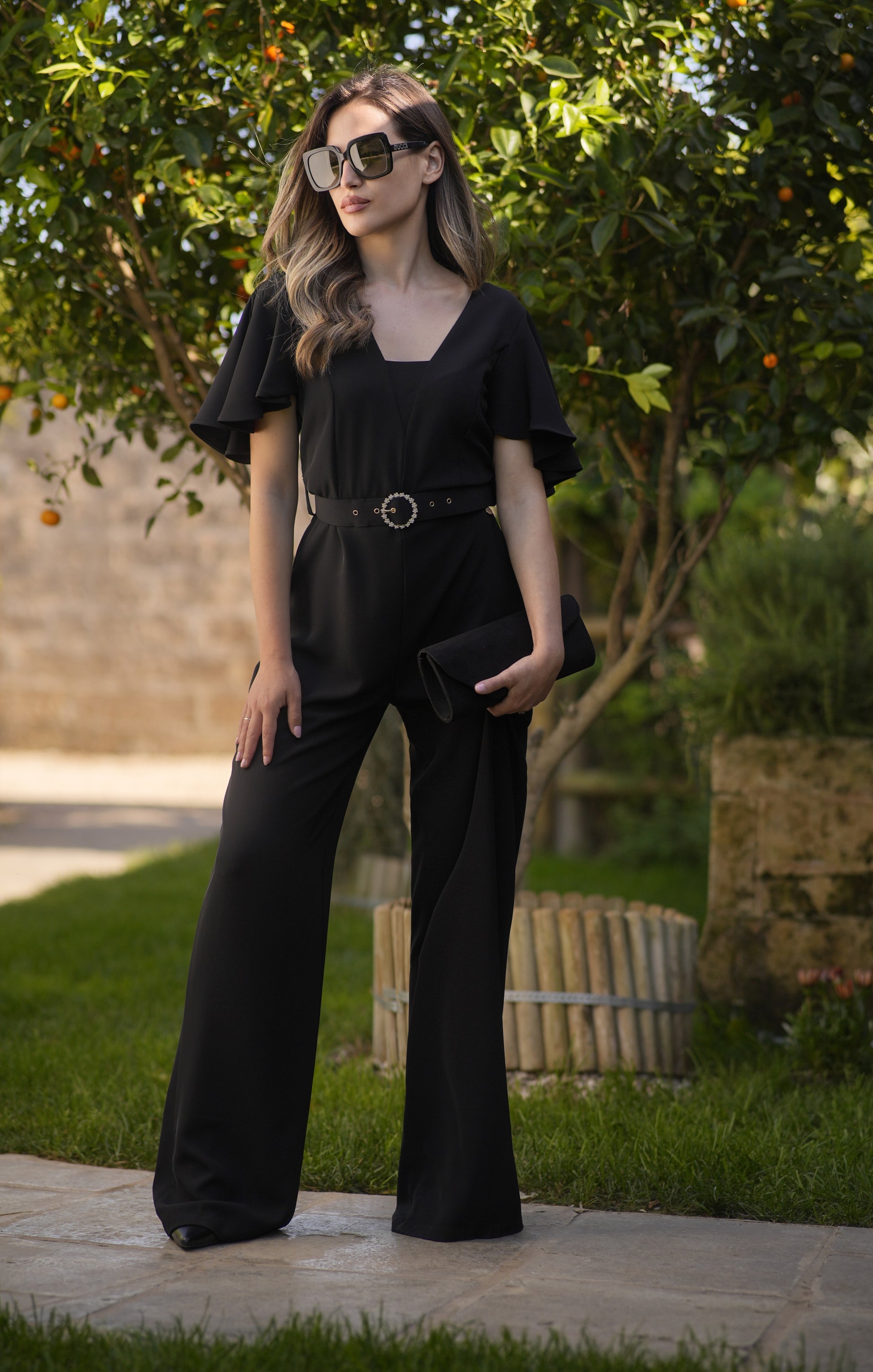 Realizzata in tessuto fluido e morbido al tatto, presenta un elegante scollo a V squadrato, maniche ampie a mantella e una silhouette scivolata che valorizza con discrezione ogni figura. Il punto vita è sottolineato da una cintura coordinata con fibbia gioiello, dettaglio che illumina l’intero outfit con un tocco glamour.